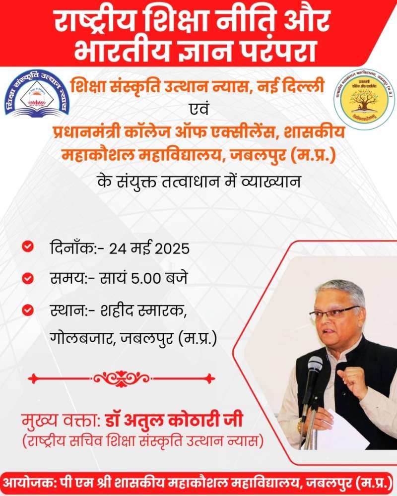 दिनांक 23 से 25 मई 2025 तक संस्कारधानी में देश के विभिन्न विषयों के प्रकांड विद्वानों का समागम होने जा रहा है अवसर है शिक्षा संस्कृति उत्थान न्यास के राष्ट्रीय शैक्षिक चिंतन शिविर का जिसमें पूरे भारतवर्ष से लगभग 30 से 40 विश्वविद्यालय के कुलगुरु विभिन्न शिक्षण संस्थानों के संचालक प्राचार्य आदि अपनी उपस्थिति ही बस दर्ज नहीं करेंगे बल्कि अपने अपने संस्थानों में किये जा रहे नवाचारों प्रयोगों के बारे मे भी जानकारी का आदान प्रदान भी करेंगे कार्यक्रम में मुख्य रूप से शिक्षा संस्कृति उत्थान न्यास के राष्ट्रीय सचिव डॉ अतुल भाई जी कोठारी ,राष्ट्रीय संयोजक ए विनोद उपस्थित होंगे इस अवसर पर विभिन्न विषयों के साथ-साथ प्रमुख रूप से राष्ट्रीय शिक्षा नीति और भारतीय ज्ञान परंपरा विषय पर चिंतन होगा जिसका एक सार्वजनिक कार्यक्रम पीएम श्री महाविद्यालय जबलपुर के संयुक्त तत्वाधान में स्थानीय शहीद स्मारक में दिनांक 24 मई 2025 को शाम 5 बजे आयोजित किया किया जा रहा है इस कार्यक्रम में माननीय उच्च शिक्षा मंत्री एवं स्कूल शिक्षा मंत्री को भी आमंत्रित किया गया जिनके आने की संभावना है विदित है कि मध्य प्रदेश प्रथम राज्य है जिसने राष्ट्रीय शिक्षा नीति 2020 को लागू किया था और अब इसका एक बैच भी निकल चुका है राष्ट्रीय शिक्षा नीति के संपूर्ण क्रियान्वन हेतु इस चिंतन शिविर में विचार विमर्श होगा इस चिंतन में विभिन्न क्षेत्रों के विद्वानों द्वारा अपने-अपने सुझाव दिए जाएंगे शिविर के अंतिम दिन विभिन्न प्रदेशों से आए हुए सुझावों को एकत्रीकरण कर उनका सार शासन को भेजा जाएगा जिससे राष्ट्रीय शिक्षा नीति को संपूर्ण भारतवर्ष में कैसे क्रियान्विन किया जा सके 24 मई को आयोजित राष्ट्रीय शिक्षा नीति और भारतीय ज्ञान परंपरा के कार्यक्रम में जबलपुर जिले के साथ-साथ महाकौशल के विभिन्न जिलों के महाविद्यालय विश्वविद्यालय विद्यालयों के संचालक प्राचार्य कुलगुरु उपस्थित होंगे जहां पर राष्ट्रीय शिक्षा नीति और भारतीय ज्ञान परंपरा विषय पर डॉ अतुल भाई जी कोठारी का मुख्य व्याख्यान होगा इस व्याख्यान से संस्कारधानी के शिक्षा जगत को भारतीय ज्ञान परंपरा के बारे में विस्तार से जानकारी प्राप्त होगी इस तरह का आयोजन संस्कारधानी में अपने आप में बहुत महत्वपूर्ण है जिसमें संपूर्ण भारतवर्ष से विद्वानों के विचारों का आदान-प्रदान होगा.