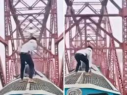 नई दिल्ली । एक बांग्लादेशी युवक ने चलती ट्रेन के ऊपर चढ़कर स्टंट किए। इस दौरान रास्ते में एक पुल भी आय़ा। वो बैरियर आने पर बैठ गया और फिर दोबारा खड़ा हो जाता है। ये स्टंट वो तेज रफ्तार वाली चलती ट्रेन पर करता है। वीडियो को देखने के बाद सोशल मीडिया यूजर्स इसकी काफी आलोचना कर रहे हैं। इनका कहना है कि ऐसा खतरनाक खेल खेलने के कारण उसकी जान तक जा सकती थी।