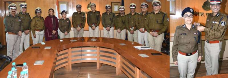 डीजीपी सुधीर कुमार सक्सेना ने पुलिस मुख्यालय में एडीजी श्रीमती दीपिका सूरी, आईजी श्रीमती रुचिवर्धन मिश्र, आईजी श्रीमती हिमानी खन्ना, आईजी विनीत खन्ना, आईजी अनुराग शर्मा, डीआईजी तुषारकांत विद्यार्थी, डीआईजी सत्येन्द्र कुमार शुक्ला, डीआईजी प्रशांत खरे, डीआईजी अतुल सिंह, डीआईजी डॉ. विनीत कपूर और डीआईजी हेमंत सिंह चौहान को रैंक लगाई।