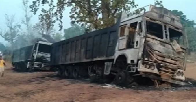 नक्सलियों ने लौह अयस्क से भरे ट्रकों को लगाई आग