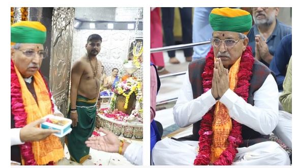 उज्जैन । केंद्रीय कानून एवं न्याय मंत्री अर्जुन राम मेघवाल ने उज्जैन प्रवास के दौरान शनिवार को श्री महाकालेश्वर मंदिर पहुंचकर बाबा महाकाल के दर्शन किए। मेघवाल ने चांदी द्वार से बाबा महाकाल का पूजन अर्चन किया और फिर नंदी हॉल में बैठकर ध्यान भी लगाया। श्री महाकालेश्वर मंदिर के पुजारी पंडित अर्पित शर्मा ने बताया कि भारत के कानून एवं न्याय मंत्री अर्जुन राम मेघवाल ने विश्व प्रसिद्ध बाबा महाकाल का पूजन अर्चन कर उनका आशीर्वाद प्राप्त किया। श्री महाकालेश्वर मंदिर प्रबंध समिति की ओर से प्रशासक एवं अपर कलेक्टर संदीप सोनी ने मेघवाल का स्वागत और सम्मान किया। दर्शन के दौरान केंद्रीय मंत्री मेघवाल के साथ महापौर मुकेश टटवाल, पूर्व सांसद चिंतामण मालवीय उपस्थित थे।